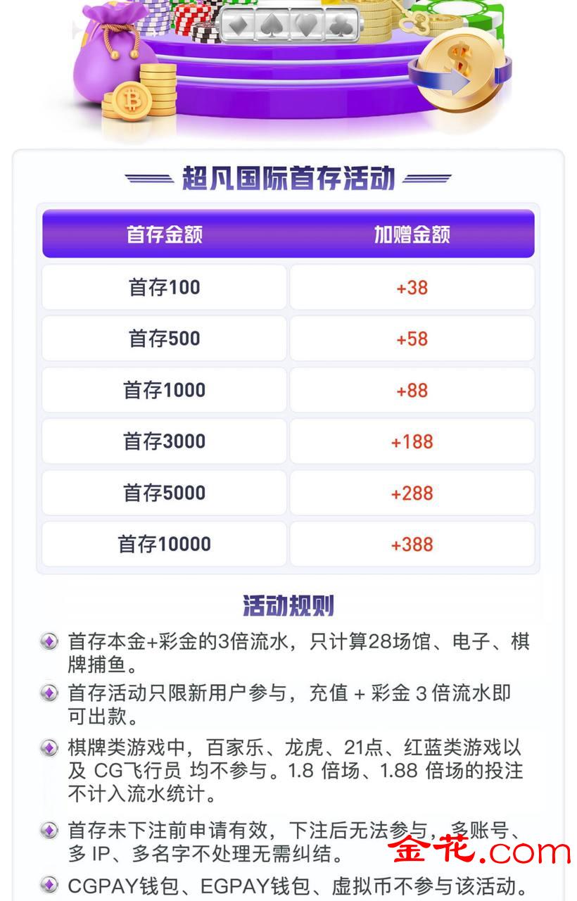 活动1:首存活动,100+38、500+58、1000+88、3000+188、5000+288、10000+388、流水要求本金+彩金3倍,钱包和虚拟币充值不算,只计算支付宝或者人民币支付。有电子盈亏福利