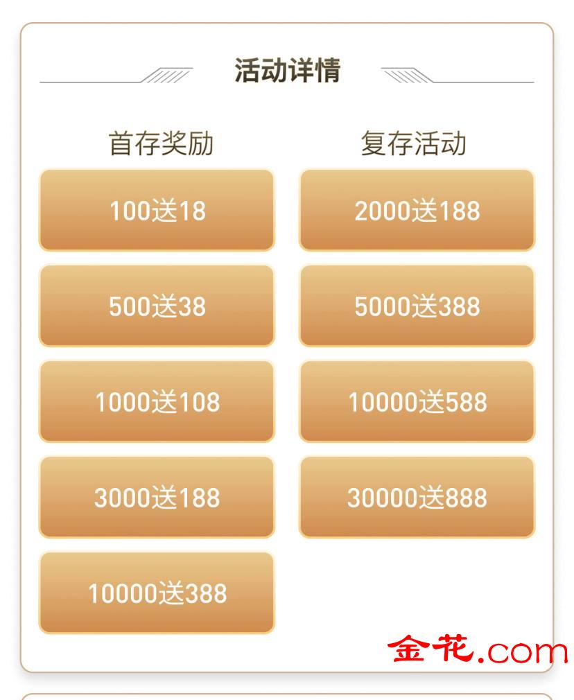 活动1:首存活动,50+18,100+28、500+38、1000+108、2000+108、3000+188、10000+388、复存500+58、200+188、5000+388、10000+588、30000+888流水要求本金+彩金3倍,钱包和虚拟币充值不算,只计算支付宝或者人民币支付。有电子盈亏福利